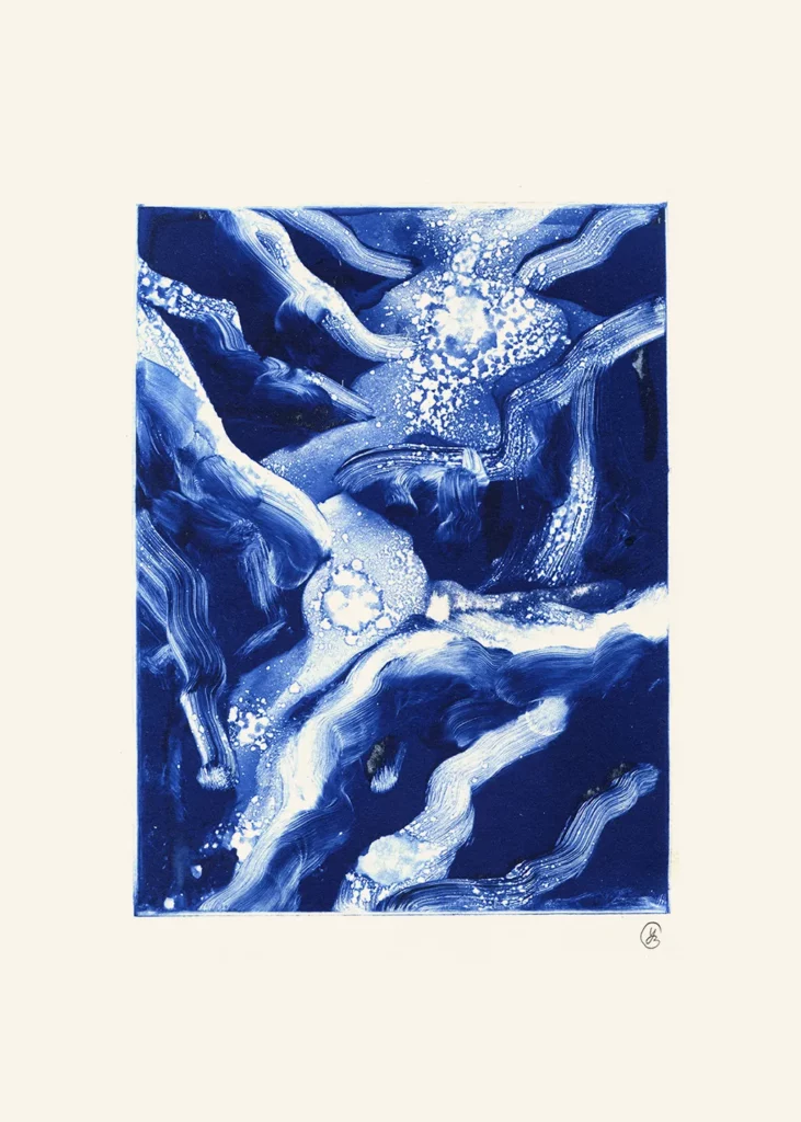 Pour l’exposition, une sélection de monotypes réalisés à la lecture du texte poignant « Eremia » de l’autrice Zinaïda Polimenova (paru aux Éditions du Chemin de fer), rejoignent la dimension charnelle du titre Bleu désir. Une cartographie des péripéties liées à l’exil qu’il transforme par l’esprit en encres de mémoire.