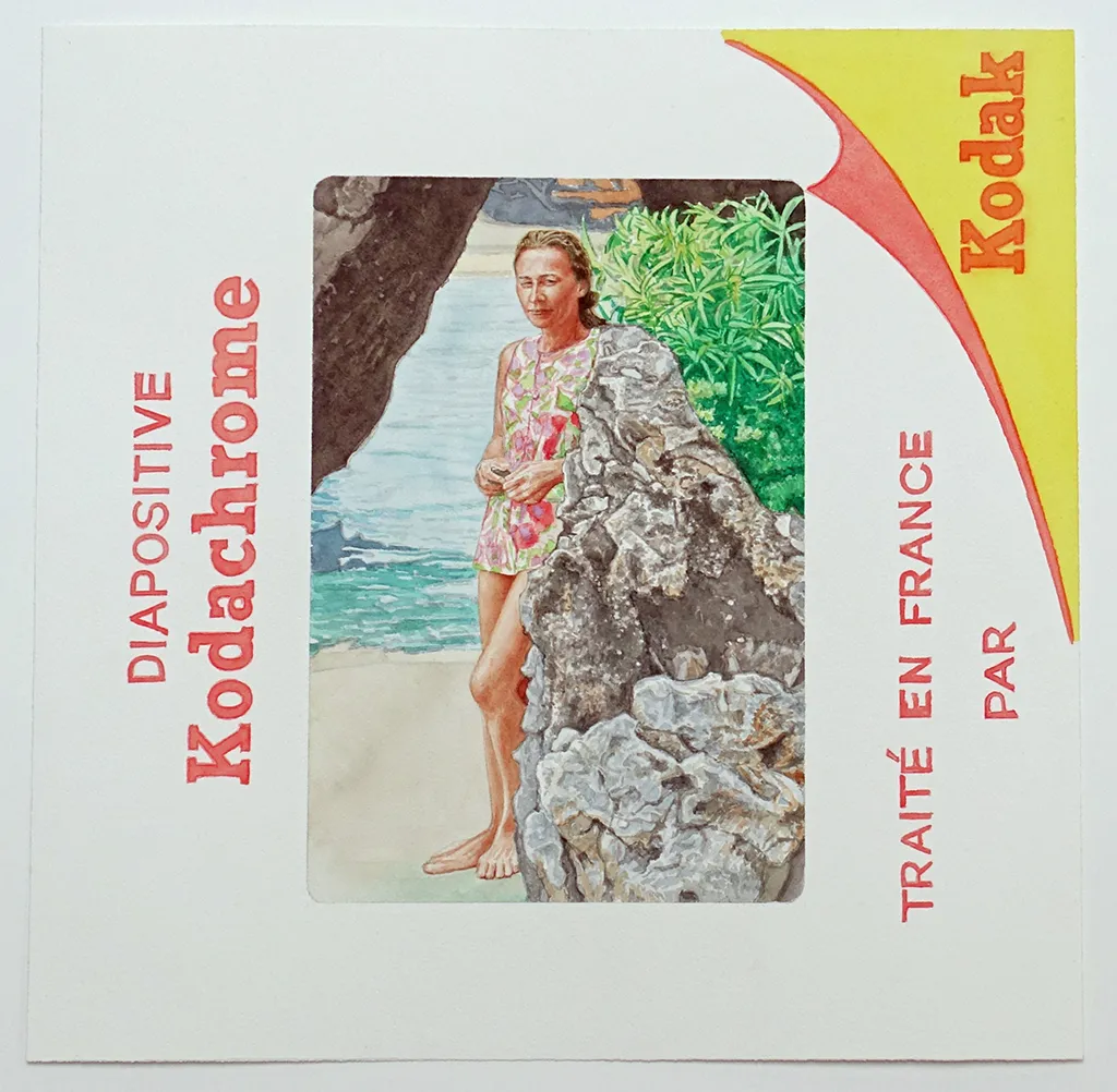 Depuis 2019, il poursuit cette mise en abime dans sa nouvelle série des Diaquarelles. Métaphore du bocal au carré, la diapositive s’inscrit dans sa recherche de transparence. L’agrandissement à l’aquarelle dilue avec empathie le regard d’anonymes dans le rétro-éclairage du passé d’avant l’ère du téléphone portable ! Car le film photographique qui conserve des souvenirs immobiles de vacances, et des séquences d’histoires petites et grandes, ramène le sujet à son environnement : celui du cadre en carton flanqué de la marque du développeur ; le sceau d’une nouvelle peinture de genre.