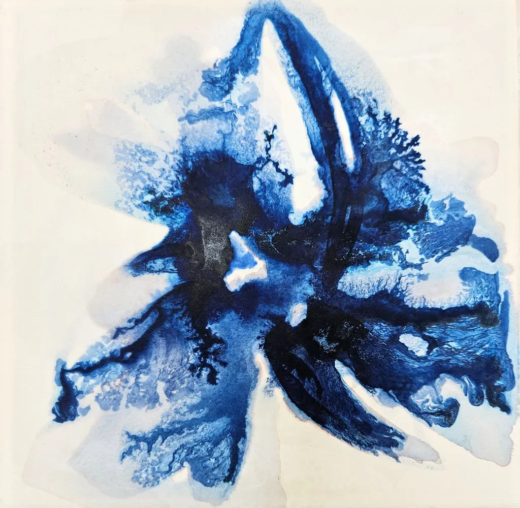 Depuis plusieurs décennies Patricia Erbelding enrichit le courant de l’abstraction contemporaine d’un onirisme proche d’une écriture originelle. Elle explore la « capsule temporelle » que lui inspirent les grottes pariétales et autres témoignages immémoriaux conservés sous l’action de l’eau et les mouvements géologiques. L’abstraction sollicite davantage le geste ; aussi affectionne-t-elle les formats à sa taille, pour être au centre de la peinture et au-dessus du vide. Elle contrôle l’harmonie, la lumière, son souffle et la respiration du papier. Elle cultive ce lien imaginaire en employant les ressources de la terre en guise de palette. Les matériaux sont porteurs de sens. Elle recrée sur la toile l’alchimie des éléments quand l’eau dilue comme elle emporte les sédiments, quand la rouille brûle le support comme le feu et que la cire protège. La récente série « Indigo » réalisée pour l’exposition Bleu Désir s’épanouit dans une dimension sensible et sensuelle où l’espace et le temps s’appréhendent en apesanteur dans des paréidolies aqueuses.