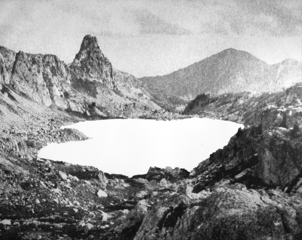 Quand fond la neige (tirages argentiques partiellement effacés, 2014-2017), taches blanches et lisses dans l’écrin montagneux du Parc national du Mercantour, les lacs semblent avoir été dissouts par la fonte des neiges. En interrogation, le blanc miroitant de la surface négative de l’image noir et blanc, issue de la photothèque du parc. Effacés à l’aide de ferrocyanure de potassium – utilisé en retouche argentique pour affaiblir l’image –, les lacs montagnards se métamorphosent en images fictions d’un manque engloutissant les légendes et les superstitions que porte leur toponymie, appelant peut-être, dans leur irréalité, d’autres narratifs de l’histoire des paysages et de leur évolution contemporaine.
