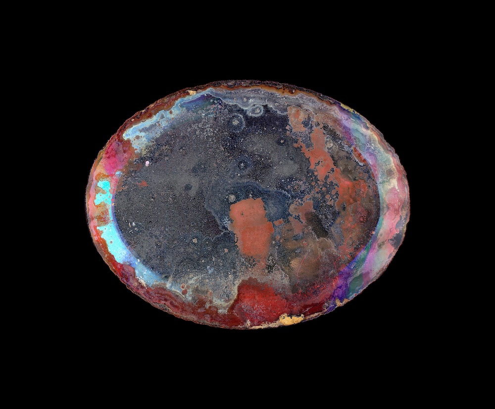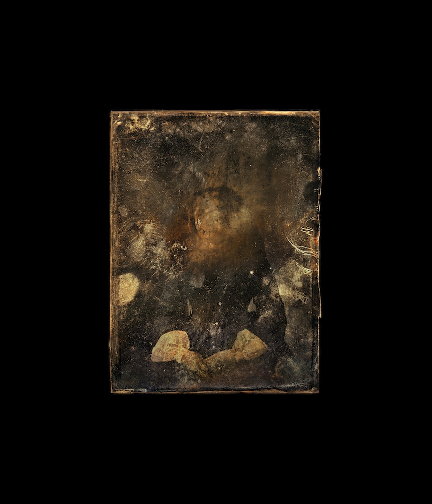 Ébloui sous la lampe à balayage d’une photocopieuse ou la source lumineuse d’un scanner, le miroir intact ne renvoie que du noir, fusionnant, dans l’absence plane d’image, le reflet et ce qu’on en perçoit. Les défauts, le vieillissement et les accidents de la surface réfléchissante au mercure et du support – tain piqué, bords altérés, rayures, brisures, abrasion, oxydation, scintillements, effets dus à l’épaisseur du verre, traces de manipulation… – , s’accentuent de visibilité, s’épanchent ou explosent en taches, en traits et en formes de couleurs, juxtaposés ou mêlés, comme autant de fantômes d’une matérialité irréelle. De ce test expérimental des limites de la capacité à faire image des appareils de reprographie, Isabelle Giovacchini tire Vif-Argent (tirages au jet d’encre pigmentaire 2025). Pure abstraction du vide d’un au-delà du miroir et d’une histoire physico-chimique à réveiller, l’erreur chromatique d’une absence de la représentation questionne la spécularité de l’imaginaire en abstractions ou en paysages et galaxies de l’invisible. Poussant l’expérience dans Les Métamorphoses (tirages au jet d’encre pigmentaire, 2024), Isabelle Giovacchini scanne les daguerréotypes abimés de la collection de la Société française de Photographie. Les plaques altérées, qui ont perdu, partiellement ou totalement leur figuration et leur capacité à réfléchir le regardeur, échangent sous la lumière du scanner les nuances de noirs et de gris en effets colorés où prennent forme en images flottantes leur dégradation et leurs manipulations, rayures, corrosion, traces de doigts… La mémoire matérielle révélée réactive les questionnements anciens sur le médium et le temps spectral de la photographie lorsqu’apparaissent, nimbées de leur effacement, les traces de la disparition d’un portrait ou d’un paysage.