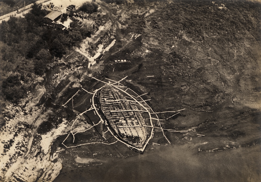 À la suite, la série Nemi (2020-2025) anime le long mur du Centre d’art d’une intrigue archéologique toujours d’actualité : la fouille par assèchement du lac volcanique de Nemi sous l’impulsion de Benito Mussolini, le dégagement et la restauration en 1929-1930 de deux navires de Caligula dédiés au culte de Diane, leur exposition dans le musée construit sur le bord du lac et l’incendie du musée en juin 1944 après avoir été réquisitionné pour abriter des réfugiés. Présentée comme la vague d’une fresque cadencée par l’alternance d’images collées ou accrochées au mur et de vitrines muséales, l’intrigue engage le regard du visiteur à suivre le mouvement de tirages et de reproductions, argentiques et jet d’encre, de différents formats et de différentes époques, à s’approcher, à prendre du recul pour observer, dans le doute, en absence de cartels, les photographies du lac, des plongeurs, des bateaux émergés…, à plonger pour découvrir le livre des fouilles de Guido Ucelli, créateur du Museo Nazionale della Scienza e della Tecnica Leonardo da Vinci de Milan, Le Navi di Nemi, les documents et les répliques, les images et les objets glanés… Pastiche d’une mise en scène de recherche, où les archives, conservées au musée, la documentation scientifique, les images réalisées par l’artiste, les objets collectés ou reproduits se nourrissent mutuellement ; l’installation joue du trouble et du brouillage des strates, multipliant et croisant les récits possibles : histoire antique de la construction, de l’utilisation des palais flottants et de leur destruction par immersion ; fouilles et propagande archéologique mussolinienne ; dispersion des artefacts ; construction, destruction et restitution du musée et des maquettes. La fiction poétique et documentaire restitue et réinvente les mystères du site dans les entrelacements complexes des fragments, des traces et des indices et de leur interprétation ; elle pose en doute ce qui fait récit d’histoire, documentation scientifique et restitution muséale, laissant la question ouverte à l’imaginaire.