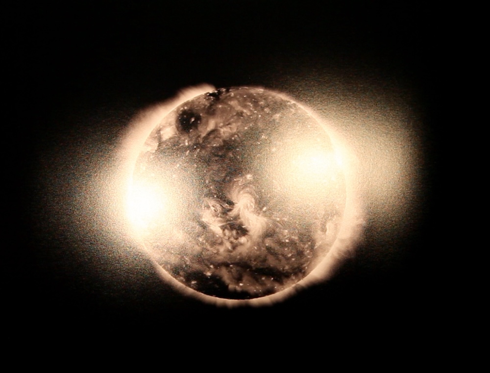 Dans ce travail de transfiguration photographique, la lumière, objet et source d’expérimentation pour son potentiel d’artificialité, concoure, dans le détournement du sens, à des fictions documentaires plus ou moins mystérieuses. En Leçons de ténèbres (vidéoprojection en boucle, 2011), irradiations et taches de lumière se reflètent sur une image collectée, noir et blanc, du soleil, l’entourent d’un nimbe lumineux instable. Des torches hors champ tenues à la main animent la reproduction de l’étoile de forces gravitationnelles provenues de l’inconnu, de ce qu’on peut, peut-être, observer des ténèbres.