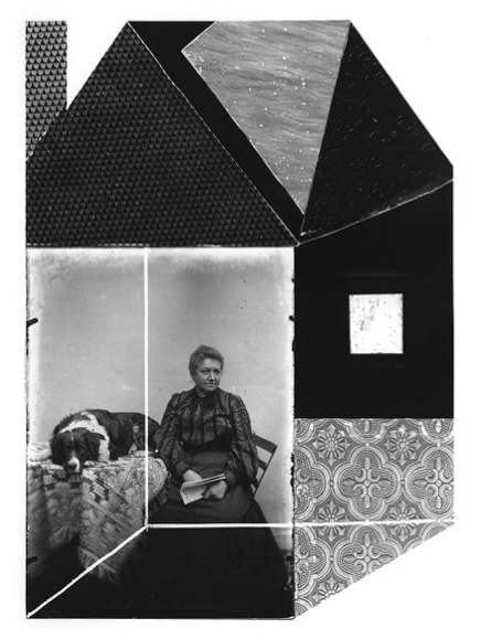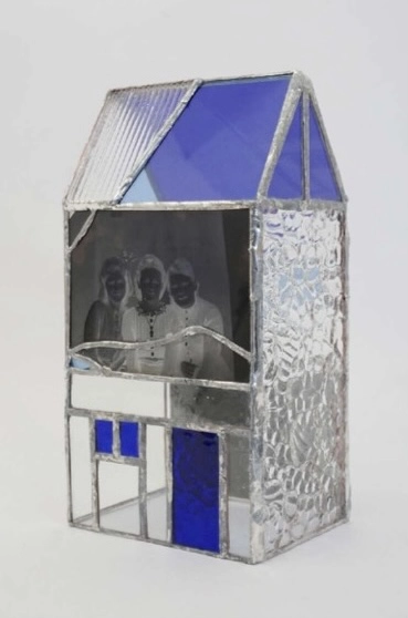 Mais l’ensemble des œuvres exposées développent la thématique de la maison dans son intégrité avec des finalisations très diverses. Une mise en place des matériaux conçue en noir et blanc place côte à côte pour Les Chambres un photogramme contact proche du croquis et une plaque de verre recevant la figure d’un individu isolé. Les généalogiques existent sous deux formes une version 2D en couleurs réactives des portraits familiaux issus des classes moyennes et bourgeoises françaises des années 1920 à 1950 trouvés en brocante. L’artiste y associe des structures de verres colorés et de petits vitraux Tiffany. Plus convaincantes encore, les sculptures de verre jouent des mêmes éléments constitutifs pour un rendu évoquant des maquettes miniatures hautes en couleur. Le côté générique et pluriel du titre laisse paraitre une visée sociologique et de psychogénéalogie qui révèle l’inscription de ces ensembles dans une approche d’un inconscient collectif de l’attachement à la demeure réattribuée à ces anonymes.