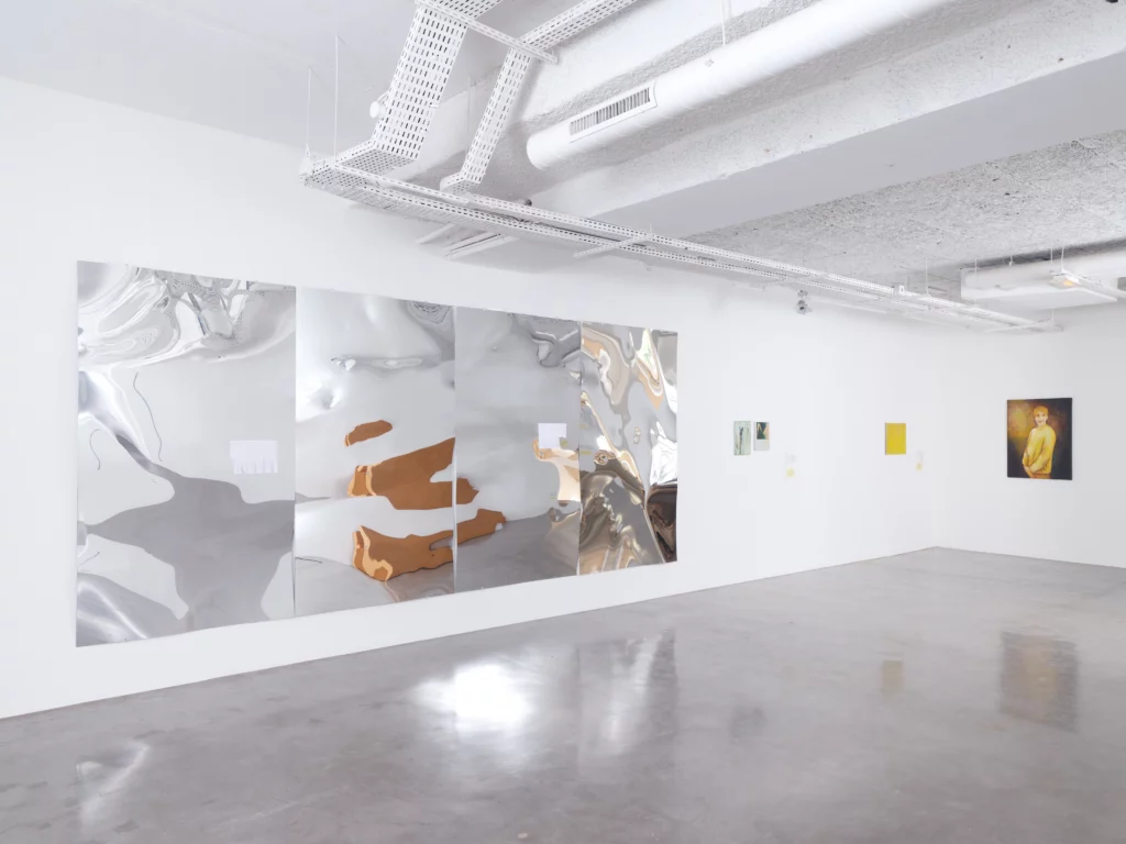 Jean-Luc Blanc ouvre ses archives, issues de la collecte de sources hétérogènes (cinéma, presse, revues, cartes postales, publicités…), au public dans un rayonnage et sur une table de consultation. Il en extrait des figures qu’il reproduit à l’huile en camaïeu. Frontale, lumineuse, en écho au tableau de Pierre Bonnard, l’image du portrait et de la pose figée se trouble, se fragilise en étrangeté. Les miroirs déformés et déformants de Jagna Ciuchta égarent l’espace d’exposition et les œuvres, les brouillent de la déambulation et du regard des visiteurs. De ce monde mouvant, intervenant sur l’œuvre, Mélanie Counsell interpelle le public par des phrases énigmatiques à détacher et emporter. Dans un jeu du reflet et du caché, réverbérées par les miroirs, les caisses fermées de Maurice Blaussyld, dont le cartel énumère les matériaux, réels ou potentiels, mettent en mystère le temps présent et à venir de l’exposition, dont l’installation de Joëlle Tuerlinckx en inscrit l’actualité dans les traces et les potentialités de la présentation. En réfraction et à distance des miroirs, les bribes d’images de My-Lan Hoang-Thuy s’ourdissent dans la surface acrylique en boro de saisons incertaines.