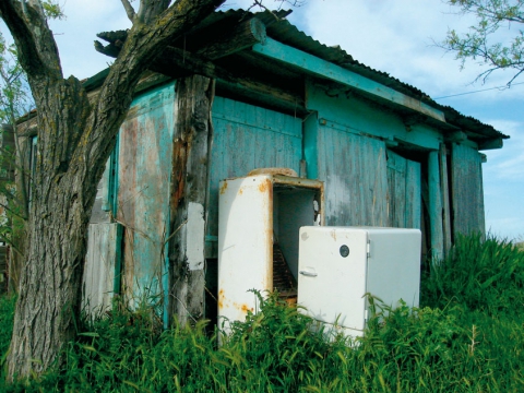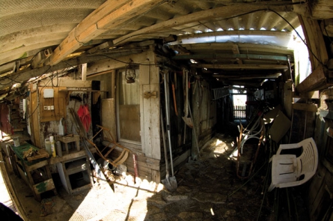 Mais les cabanes les plus anciennes étaient résistantes, impénétrables, portes et fenêtres obturées, parois de bois revêtues de tôles goudronnées. Elles avaient un aspect massif de conteneur à l’épreuve du temps, protégées par la présence imaginée d’un cabanier disparu. Un lieu de vie abandonné mais occupé. Quelques planches disjointes, un volet qui bâille laissent cependant entrevoir les intérieurs. Bras tendu, en aveugle, j’ai glissé mon appareil dans ces béances providentielles. L’image des pilleurs de tombes étrusques qui explorent l’intérieur des sépultures en y introduisant une sonde endoscopique m’est revenue en mémoire. Malgré l’excitation du moment due à la découverte des premiers clichés, l’idée de la profanation me troublait. J’ai survolé les lieux sur la pointe des pieds, attentivement à n’inscrire aucune trace parasite dans la poussière accumulée, avec pour règle absolue l’interdiction de déplacer le moindre objet ou de modifier la faible lumière ambiante. J’ai décidé aussi d’accepter les noirs, chargés d’inconnu et de refuser les expositions multiples.