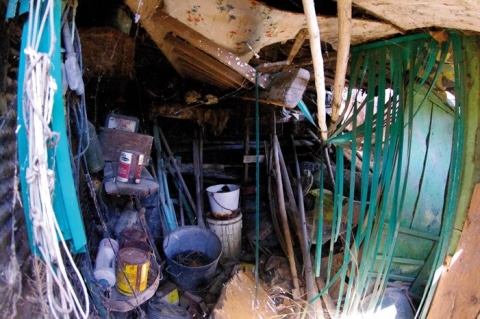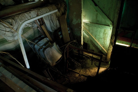 Les cercles de reconnaissance autour des cabanes ont ensuite laissé émerger les « réserves », véritables conservatoires, amoncellement latent d’objets disparates et ressource de matériaux « qui peuvent toujours servir ». Dans ces images d’accumulations aléatoires, une organisation générée par la lumière, le clair-obscur, ressort de façon évidente. Ici la lumière est de même nature que la poussière : corpusculaire, puissante d’abord dans le faisceau, puis diffuse ensuite, vite heureuse par le noir. L’effet miroir de l’étang et du canal induit une dominante chromatique verte qui unifie l’éclairement de toutes les scènes. Pour moi, la référence est d’ordre pictural, la notion de « nature morte » m’apparaît alors que je photographie. La pénombre, qui entraîne une prise de vue en haute sensibilité, donne un grain à l’image, substitut de la touche des pointillistes.