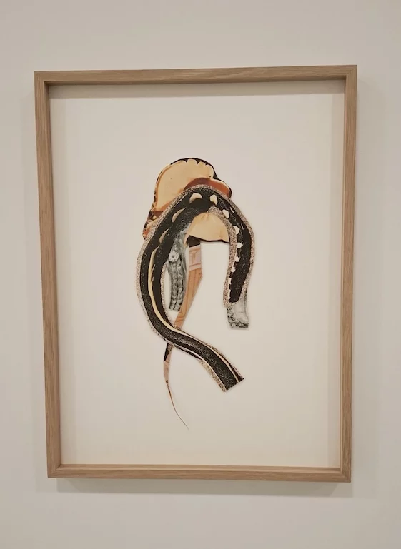 Pour ses collages réalisés à l’ancienne avec une coupe franche des documents aux ciseaux et de la colle, elle sélectionne ses éléments visuels dans les pages de manuels de vulgarisation scientifique, de livres d’art, de différents types de magazines et de livres au rebut. Beaucoup d’entre eux participent de la composition d’un bestiaire (chats, serpents, papillons…), d’autres sont faits de sérigraphies de vases évidés. Une série s’appuie sur les constats photographiques de Duchenne de Boulogne sur les malades atteints d’hystérie à la Salpêtrière.