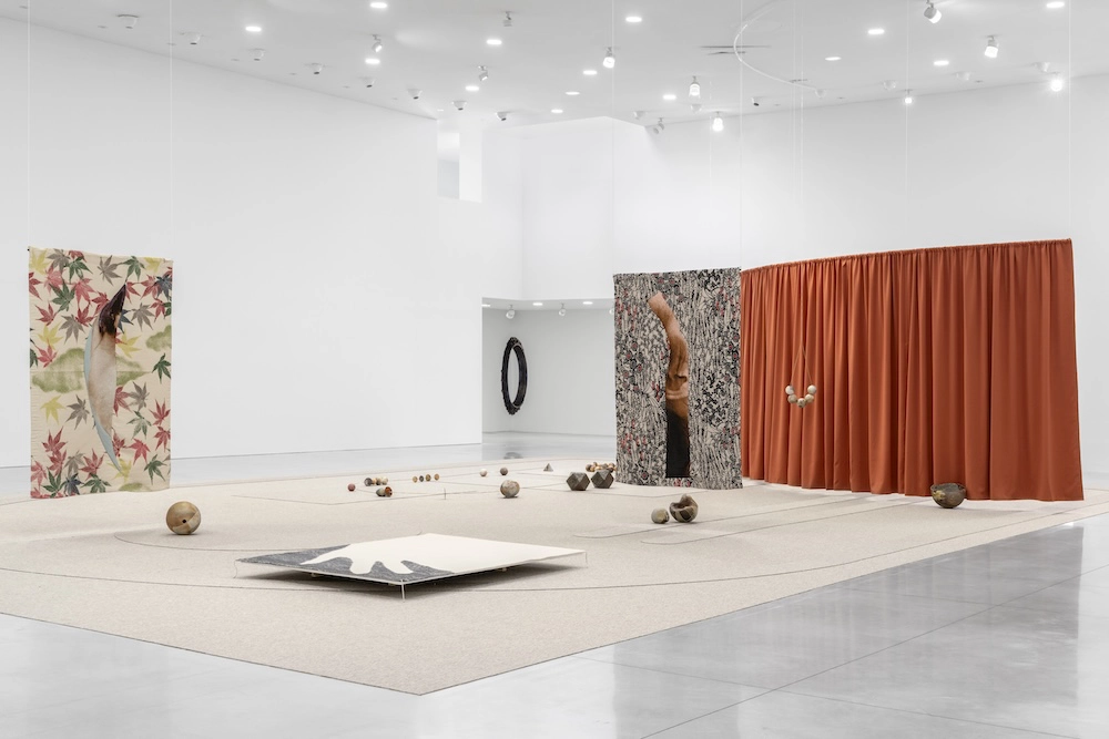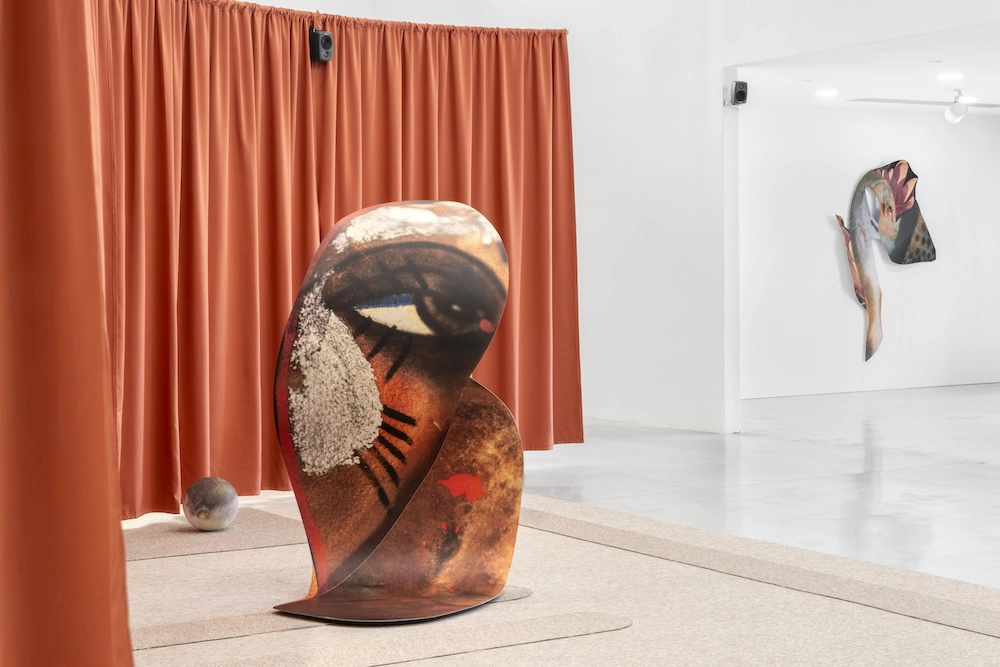 Dans la grande salle blanche, Eléonore False installe sur une immense œuvre textile au sol aux motifs géométriques noir et blanc des pièces de différentes époques. Elle fait dialoguer deux tapisseries suspendues aux collages intégrés avec une autre plus ancienne au sol représentant la main de la créatrice. Une importante partie de l’installation reçoit un assemblage de perles de verre et de céramique produites lors d’une résidence à la Borne pour un collier en devenir. Un long rideau couleur chair en référence au corps des poupées monégasques se trouve en arrière-plan, transformant l’ensemble en un petit théâtre artisanal. Quand on le dépasse, on découvre la sculpture métallique ornée d’un œil qu’il cachait et un peu plus loin, une sculpture au mur en forme de fleur comportant aussi une face animale.