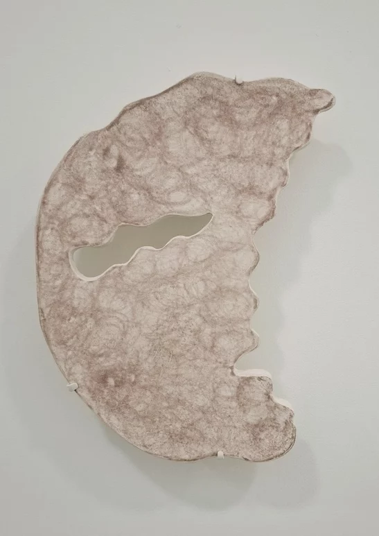 Une grande installation au sol de la galerie blanche est entourée par trois cabinets d’art graphique qui recueillent une cinquantaine de collages sur papier et quelques céramiques de petit format produites selon la technique de cuisson du Raku nu.