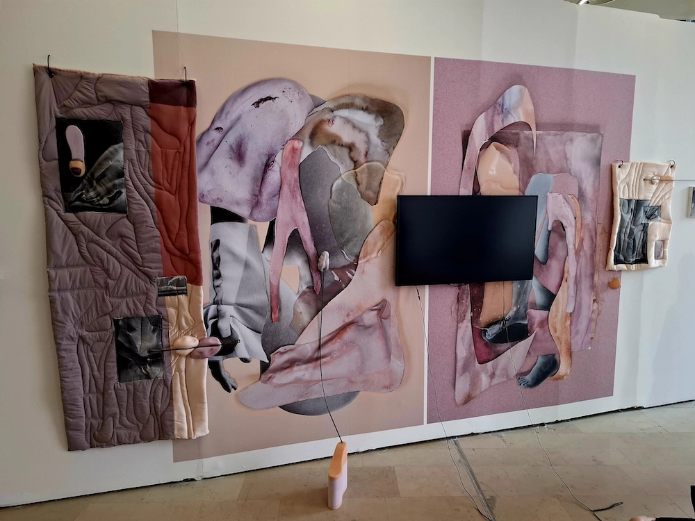 Beaucoup de ces jeunes artistes mettent en coprésence deux médias. Zoé Bernardi (diplômée de l’ENSBA) met en batterie une série de petits portraits tirés sur verre à côté de deux vidéos danse sur petit moniteur. Lina Filipovich originaire de Biélorussie, anime ses accrochages de patchworks textiles par une bande-son. Thomas Moësl (sorti de l’ISBA Besançon) diffuse ses créations sonores à travers de petites sculptures en terre mêlant art, sciences et spiritualité. Amir Youssef (diplômé des Beaux-Arts d’Alexandrie et d’Aix-en-Provence) revisite dans une visée postcoloniale l’épopée napoléonienne avec un regard critique ethnocentré à partir d’un diorama reconstitué en 3D et d’autres vidéographiés au musée de l’Armée.